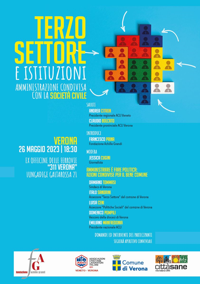 La Fondazione Achille Grandi, le ACLI di Verona e del Veneto insieme al Comune di Verona e a cittàsane – rete italiana OMS organizzano un Convegno sul tema della relazione tra Terzo Settore e Istituzioni e delle azioni condivise per il bene comune nel fare Amministrazione e Politica. Saranno presenti, in qualità di relatori, Il Sindaco di Verona Damiano Tommasi, L’Assessore “Terzo Settore” del Comune di Verona Italo Sandrini, l’Assessore alle “Politiche Sociali” del Comune di Verona Luisa Ceni, il Vescovo della Diocesi di Verona Domenico Pompili e il Presidente Nazionale ACLI Emiliano Manfredonia.